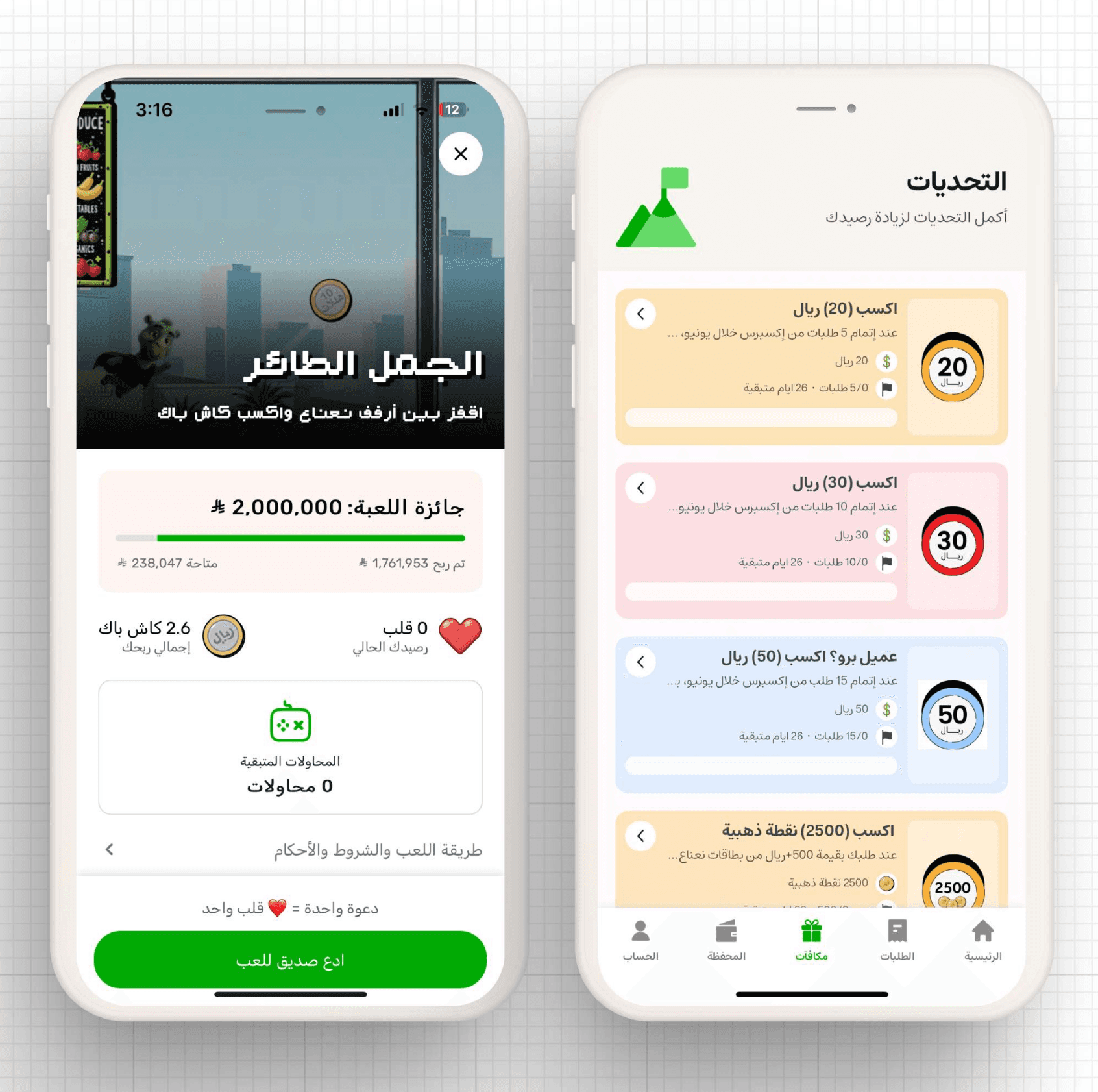 • مهام محددة مثل "أكمل 5 طلبات" أو "اطلب 15 طلبًا" مقابل جوائز مالية (ريال) أو نقاط رقمية.